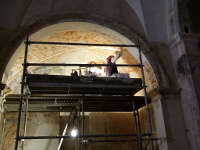 La estrategia de los restauradores se recuperar las más antiguas y mejor conservadas y dejar testigos o «ventanas» que permitan apreciar una parte de los diferentes estilos artísticos que conviven a los muros y que dan fe de diferentes etapas históricas.