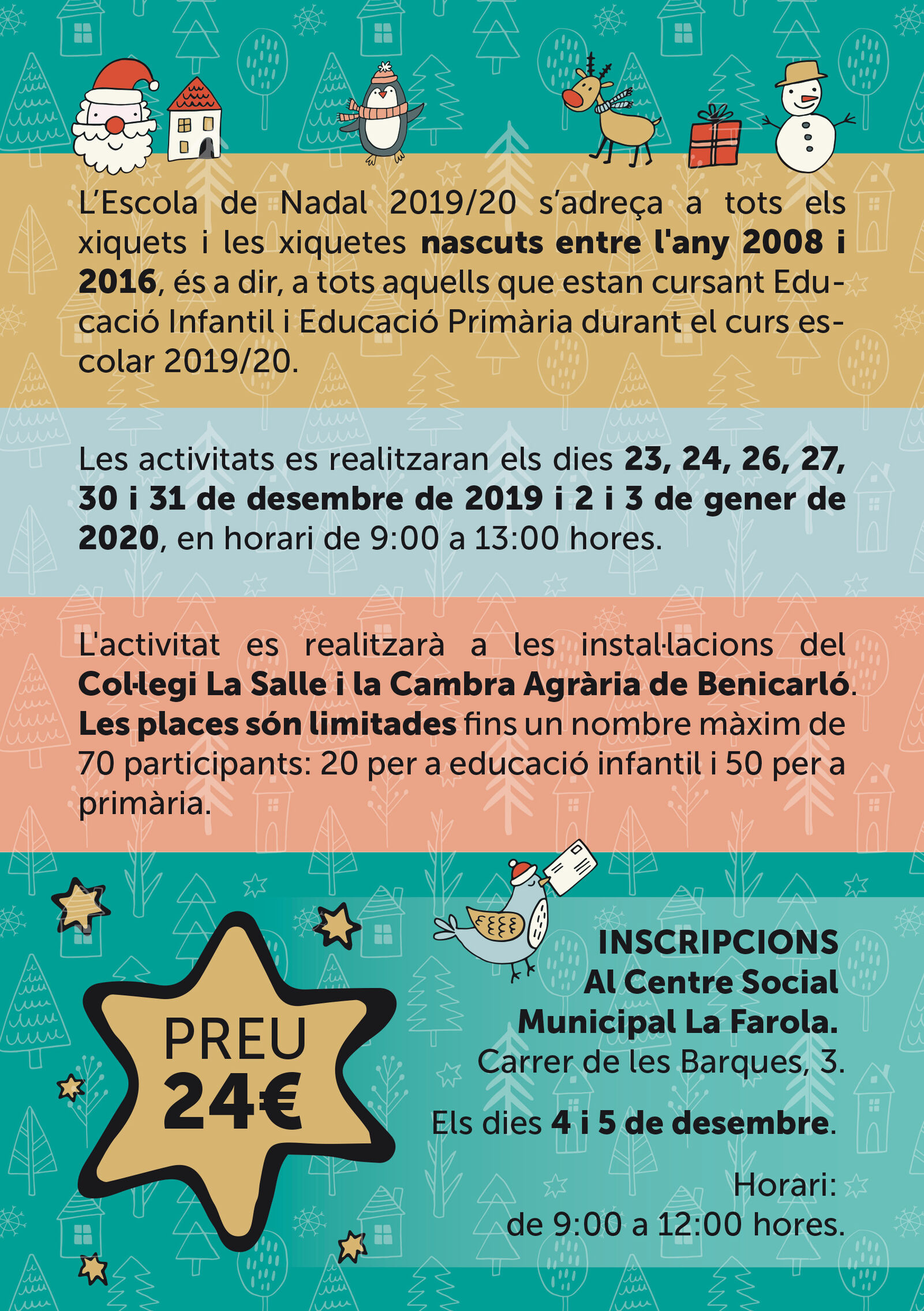 L'Escola de Nadal tindrà lloc els dies 23, 24, 26, 27, 30 i 31 de desembre i els dies 2 i 3 de gener a les instal·lacions del Col·legi La Salle i de la Cambra Agrària, en horari de matí de 9.00 a 13.00 hores, per un preu de 24 euros. Les places estan limitades a 70 participants; 20 per a educació infantil i 50 per a primària.