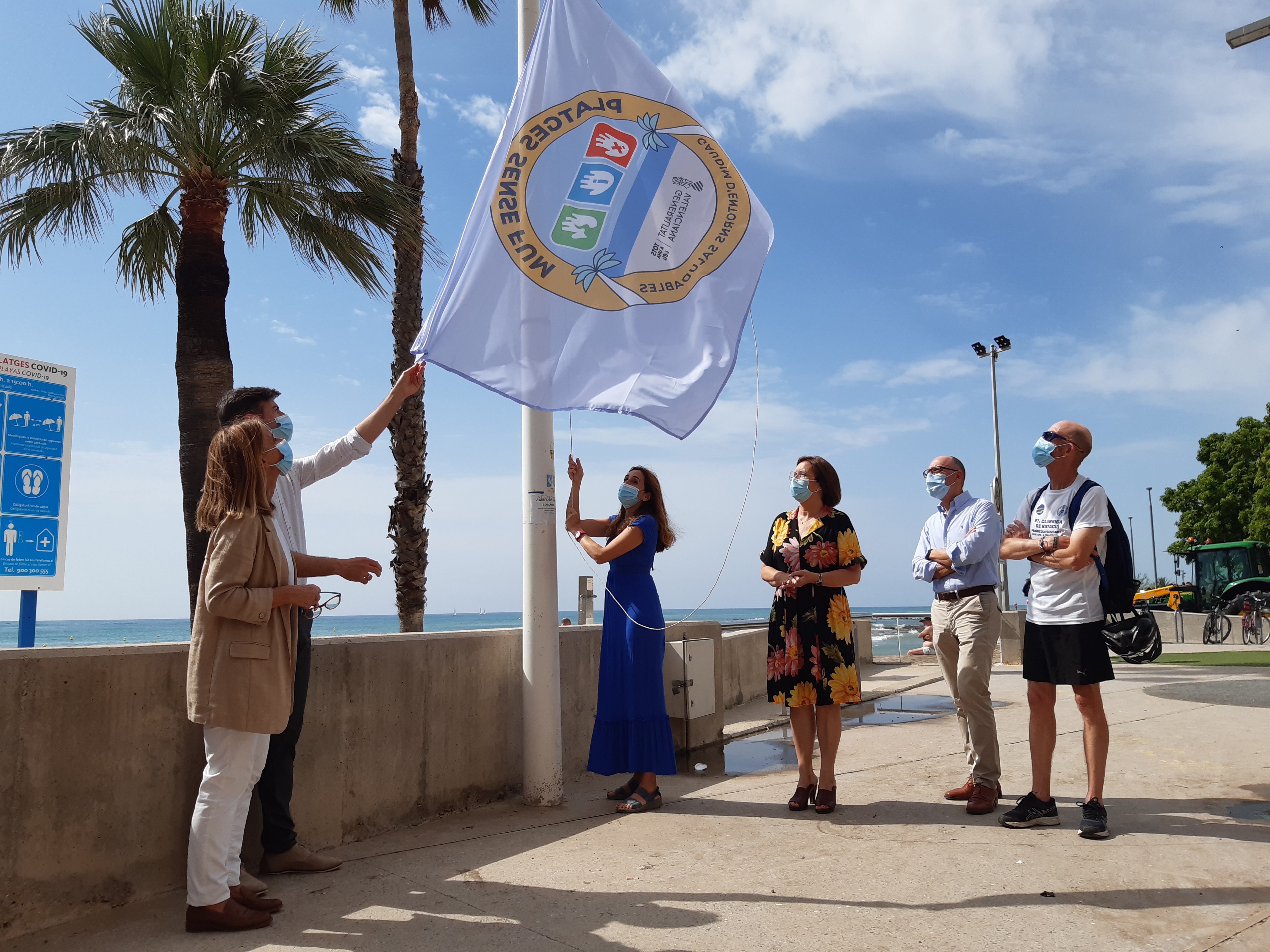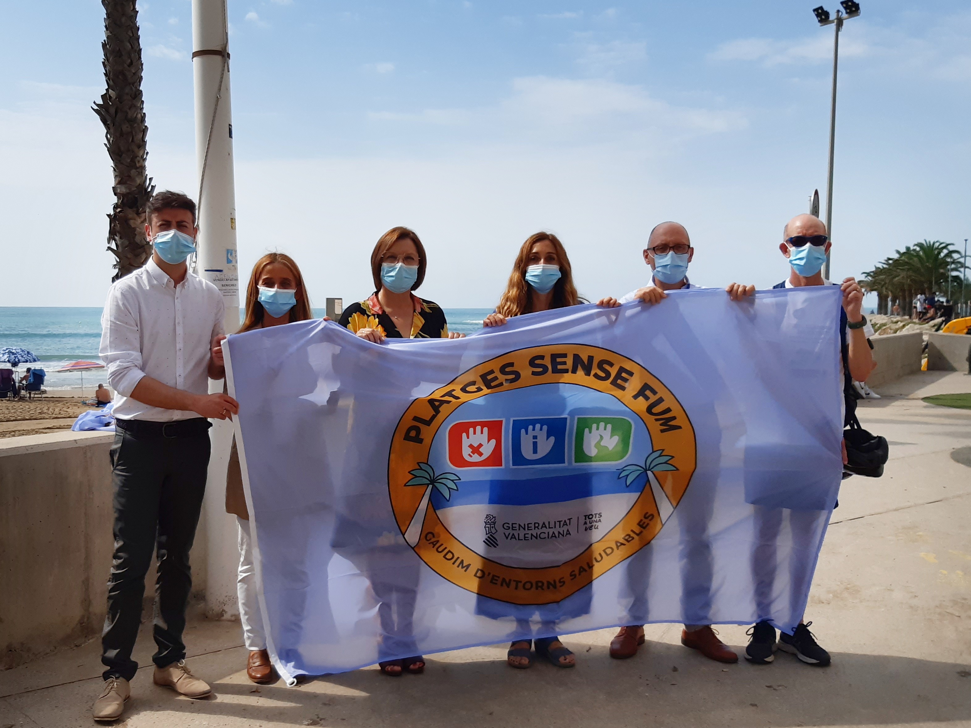 La alcaldesa de Benicarló, Xaro Miralles y la secretaria autonómica de Salud Pública, Isaura Navarro, junto con el director del Centro de Salud Pública, Antonio López, la concejala de Turismo, Isabel Cardona, y el concejal de Obras y Servicios, Ilde Añó, han izado esta mañana la bandera que acredita que la playa del Morrongo es una playa libre de humo.