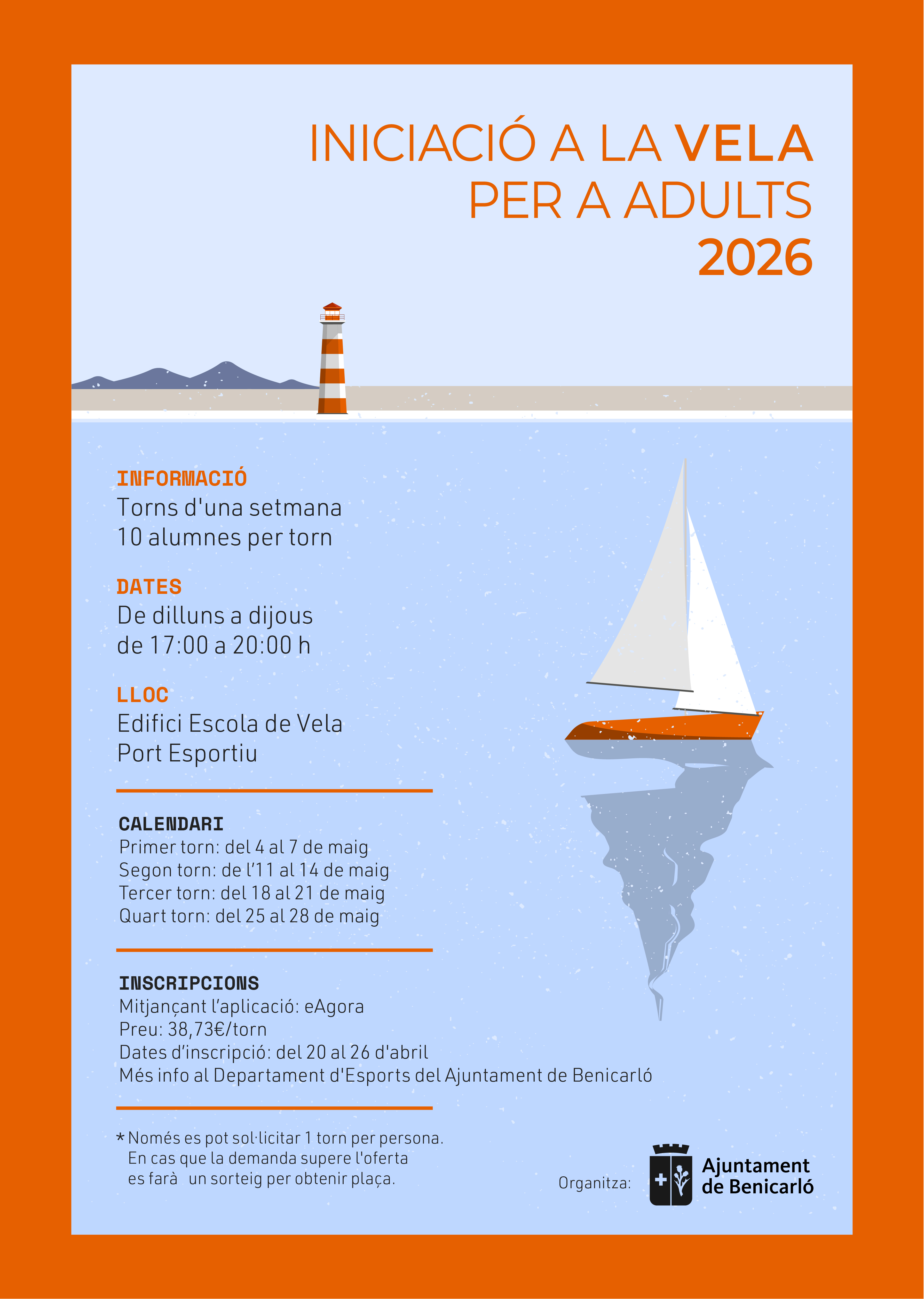 L'Ajuntament de Benicarló ha posat en marxa una nova activitat d'Iniciació a la Vela per a adults, emmarcada dins de la Campanya Esportiva Municipal 2025-2026, amb l'objectiu d'ampliar les opcions de pràctica esportiva dirigides a la població adulta i aprofitar un entorn natural privilegiat com és la mar.